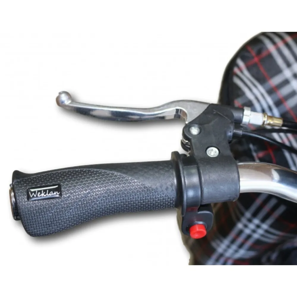 Переднее колесо диаметром 16 дюймов, задние колеса 4 дюйма, есть маленькое четвертое колесо, для плавного заезда на бордюр. Мощность мотор-колеса 500 Вт, максимальная скорость электросамоката 25 км/ч, есть задняя скорость, он очень прост в управлении. Вес 40 кг, максимальная нагрузка 150 кг. Это значительная характеристика модели. Люди со сложностью в передвижение будут более мобильны. А сидение со спинкой добавит комфорта.