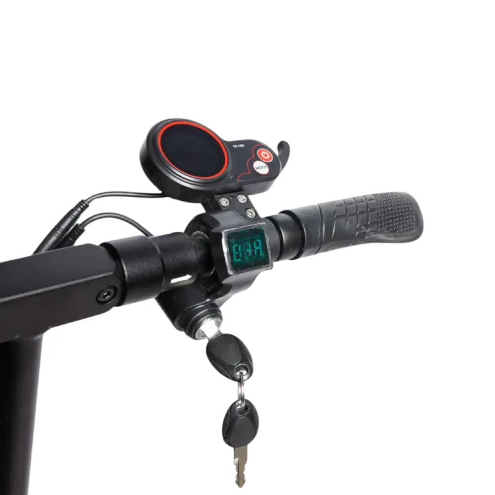 Мощность двигателя 500 Вт, колеса диаметром 10 дюймов, впереди и сзади дисковые тормоза, хорошее сцепление с дорожным покрытием не заносит на повороте. Для комфорта при движении на дальние расстояния можно установить сидение, оно регулируется по высоте, идет в комплекте. Рулевую стойку тоже можно отрегулировать