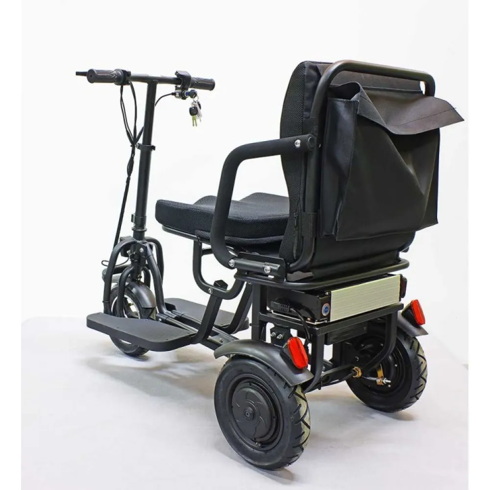 Водительское сидение широкое, имеет специальное воздухопроницаемое покрытие, позволяет длительное время находится в дороге. Техника представлена складной конструкцией, дает возможность легко транспортировать и брать с собой в путешествие. Мощность надежного двигателя 700 Вт позволяет развивать максимальную скорость 25 км/час за короткий период. Заряда емкого аккумулятора достаточно для прохождения 20 км пути без подзаряда. Современная технология изготовления батареи позволяет быстро заряжать, рассчитана на 1000 циклов заряда/разряда.