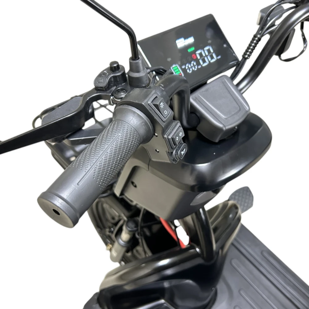 В стандартной комплектации есть зеркала, корзина, фара, стоп-сигналы и поворотники. LCD-дисплей показывает заряд, пробег и скорость, что делает поездки удобнее.