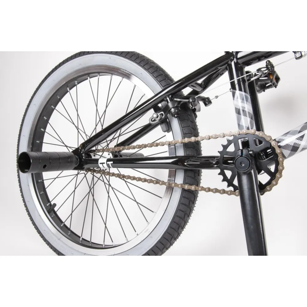 Надежная колесная часть на двойных алюминиевых ободах с накатистой резиной, брендовые покрышки, TT стальной 700 мм руль в сочетании с 4 пегами позволяют ставить трюки по рейлам и делать более серьезные манипуляции.